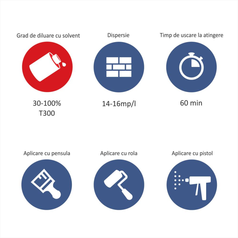 - Pentru pereți diluați până la 100% cu Brush Solvent T300 și pentru plafon până la 30%.