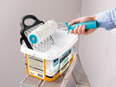 PASUL 2: Pune în găleata cu adeziv un grătar care să stea sprijinit de marginea găleții. Mișcă trafaletul încet pe grătar de sus în jos pentru ca adezivul să pătrundă în mod egal în rolă și să elimini surplusul de adeziv.