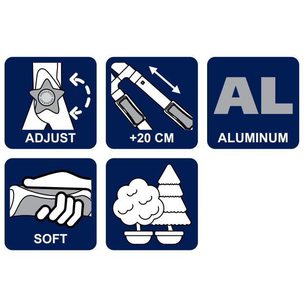 - Mâner telescopic din aluminiu, cu capete de prindere moi, pentru o mai bună accesibilitate și libertate de mișcare crescută.
