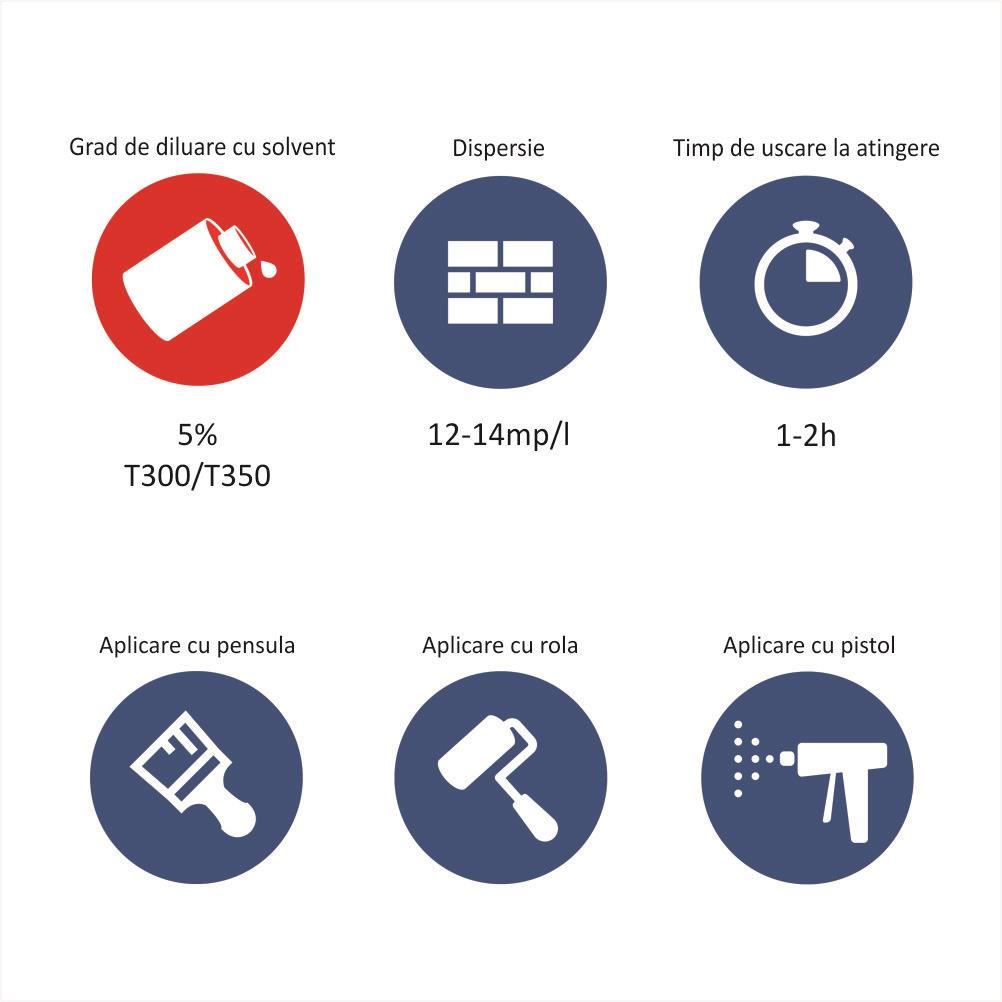 Aplicare: Se amestecă bine înainte de utilizare. Aplicaţi unul sau două straturi cu trafaletul sau pensula diluat până la 5% cu Diluant pentru pensulă T 300 sau cu pistol de pulverizare airless diluat cu până la 5%, cu Diluant pentru pistol T 350. A nu se aplica la temperaturi sub 5°C,şi peste 35°C şi/sau umiditate relativă peste 80%. Se uscă la atingere după 1-2 ore şi poate fi reaplicat dupã 20-24 ore. Timpul de uscare depinde de condiţiile meteorologice (umiditate şi temperatură). Role curate, perii, pete pe podea, etc. se curaţă cu Diluant pentru pensulă T 300 şi apoi cu apă cu săpun sau detergent. Utilizaţi Diluant pentru pistol T 350 pentru a curăţa pistoalele de pulverizare.