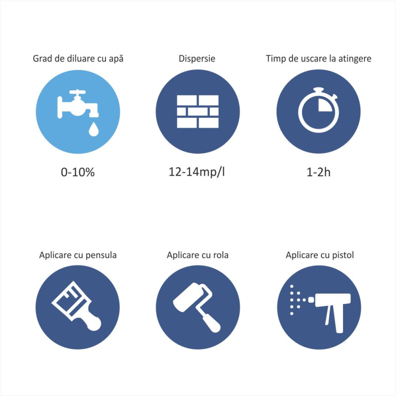 Aplicare: Se amestecă bine înainte de utilizare. Aplicați unul sau două straturi cu trafaletul, pensula sau pistolul diluat până la 10% cu apă. A nu se aplica la temperaturi sub 5°;C, peste 35°;C și/sau umiditate relativă peste 80%. Este uscat la atingere după 1-2 ore și poate fi reaplicat după 6-8 ore. Timpul de uscare depinde de condițiile meteorologice (umiditate și temperatură). Uneltele trebuie curățate imediat după utilizare cu apă și dacă este necesar cu apă și săpun sau un detergent.