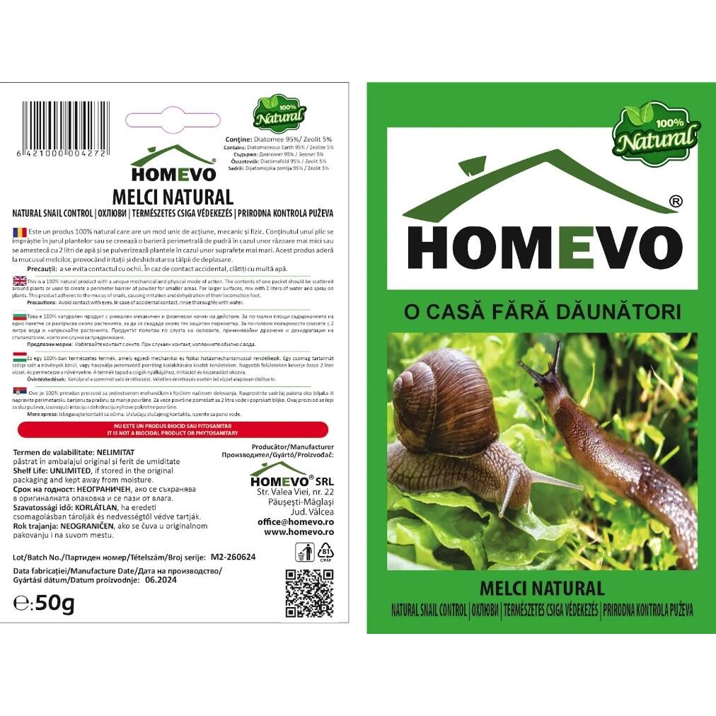 - Este un produs 100% natural utilizat pentru combaterea melcilor cu cochilie și a limacșilor. Nu este un produs periculos pentru om, animale sau mediu.