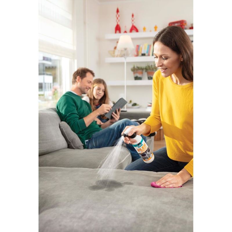 Soluția pentru curățarea petelor este un spray concentrat, foarte eficient, pentru îndepărtarea cu ușurință a petelor chiar și a celor persistente, precum vin roșu, cafea, ciocolată și cremă de pantofi.