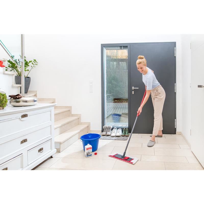 - Adăugați 3-5 capace de Soluție MELLERUD pentru curățarea marmurei într-o găleată (8-10L) de apă caldă.